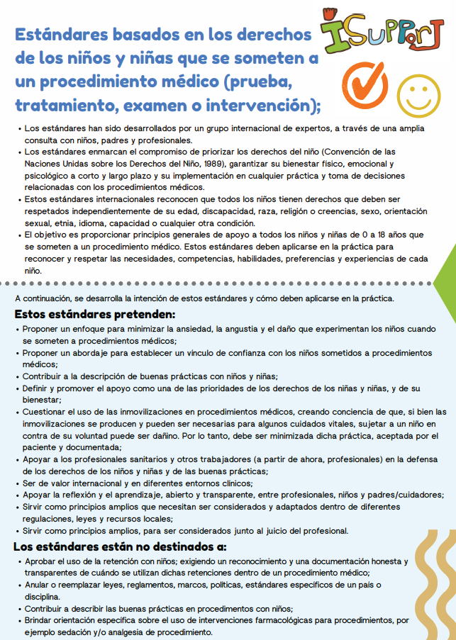 Text in Spanish that reads 'Standards based on the rights of children subjected to medical procedures', with decorative elements including a green vine, a blue heart, a green cross, and a red checkmark.